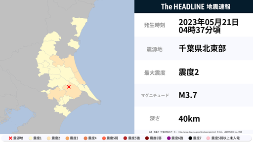5月21日4時37分頃、茨城県・千葉県で最大震度2の地震を観測