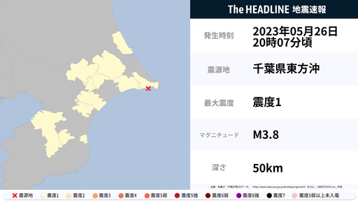 5月26日19時3分頃、茨城県・千葉県で最大震度5弱の地震を観測