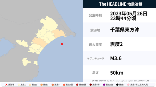 5月26日23時44分頃、千葉県で最大震度2の地震を観測