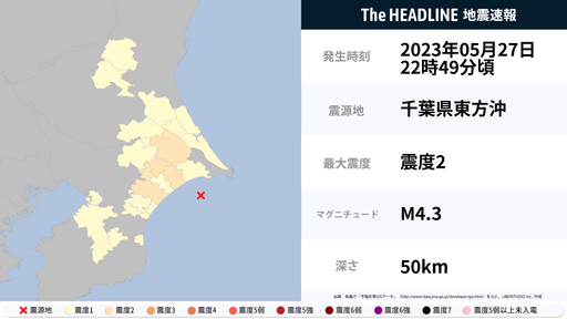 5月27日22時49分頃、千葉県で最大震度2の地震を観測