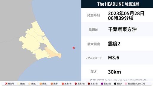 5月28日6時40分頃、千葉県で最大震度2の地震を観測