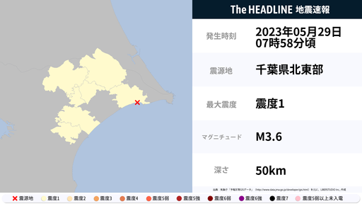 5月29日7時58分頃、千葉県で最大震度1の地震を観測