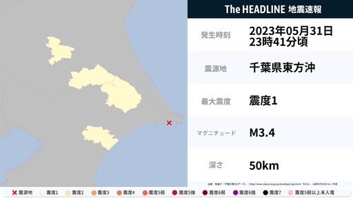 5月31日23時41分頃、茨城県・千葉県で最大震度1の地震を観測