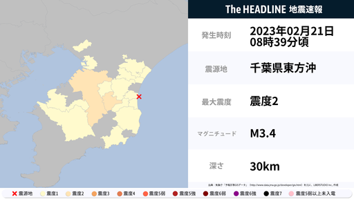 2月21日8時39分頃、千葉県で最大震度2の地震を観測