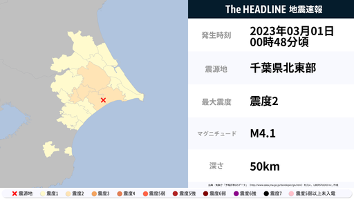 3月1日0時48分頃、千葉県で最大震度2の地震を観測