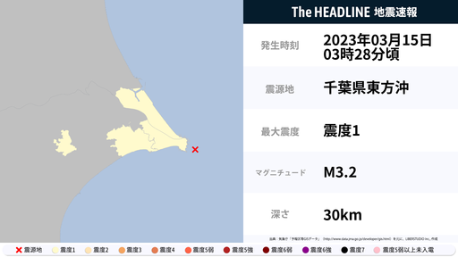 3月15日3時28分頃、茨城県・千葉県で最大震度1の地震を観測
