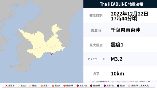12月22日17時44分頃、千葉県で最大震度1の地震を観測