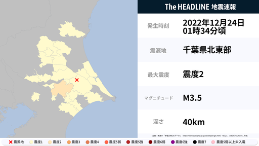 12月24日1時34分頃、千葉県で最大震度2の地震を観測