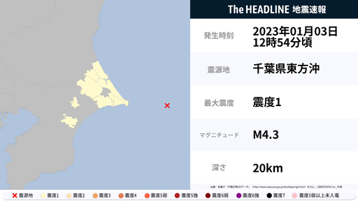1月3日12時54分頃、茨城県・千葉県で最大震度1の地震を観測