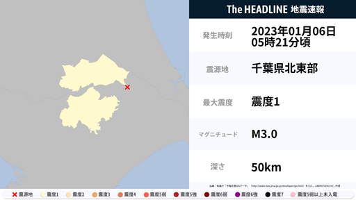 1月6日5時22分頃、茨城県・千葉県で最大震度1の地震を観測
