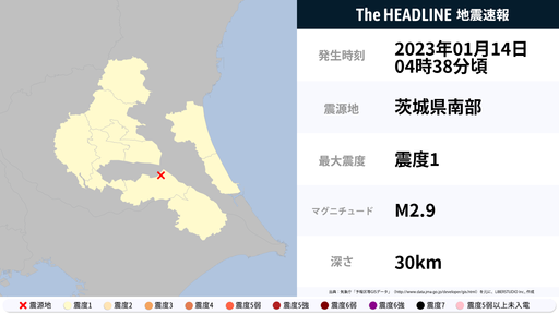 1月14日4時38分頃、茨城県・千葉県で最大震度1の地震を観測