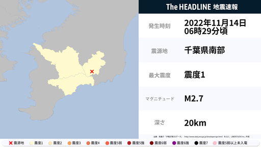 11月14日6時29分頃、千葉県で最大震度1の地震を観測