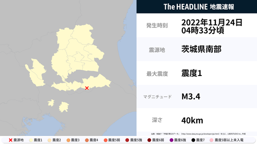 11月24日4時33分頃、茨城県・千葉県で最大震度1の地震を観測