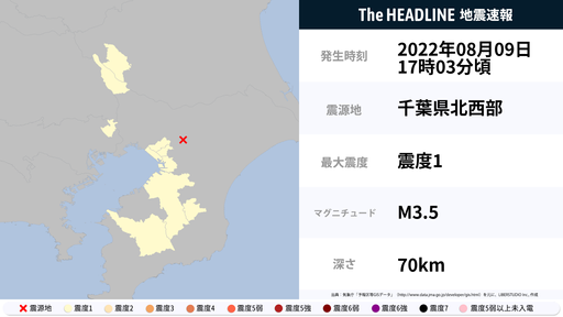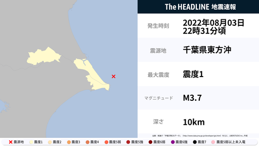 8月10日3時14分頃、千葉県・東京都などで最大震度1の地震を観測