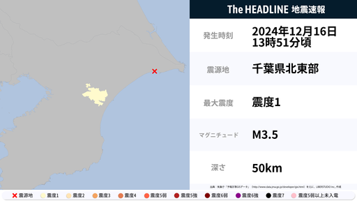 12月16日13時51分頃、千葉県で最大震度1の地震を観測