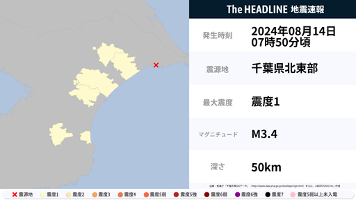 8月14日7時50分頃、千葉県で最大震度1の地震を観測