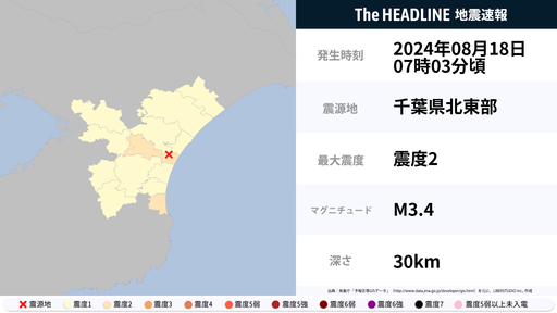 8月18日7時3分頃、千葉県で最大震度2の地震を観測