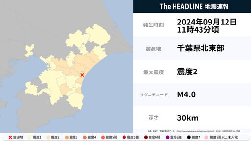 9月12日11時43分頃、千葉県で最大震度2の地震を観測