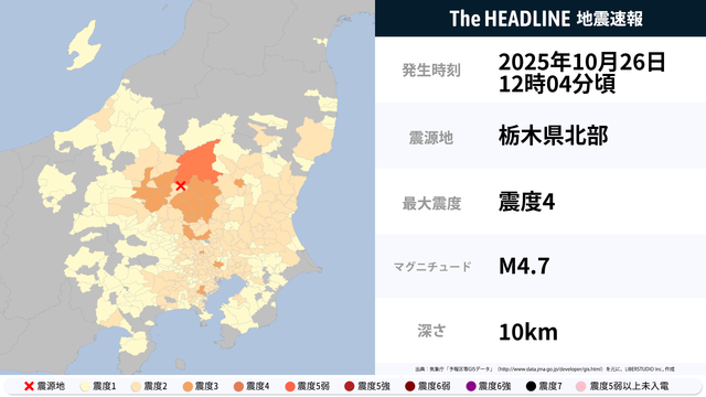 10月26日12時04分頃、栃木県北部を震源とするマグニチュード4.7の地震が観測された。最大震度4を観測したのは、栃木県。
