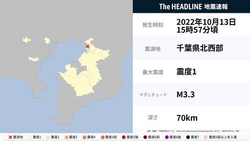 10月13日15時57分頃、千葉県・東京都などで最大震度1の地震を観測