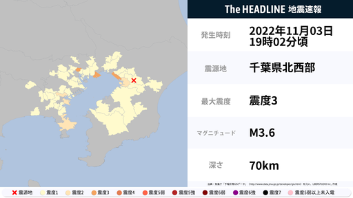 11月3日19時3分頃、千葉県・東京都で最大震度3の地震を観測