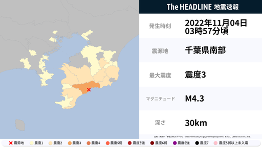 11月4日3時57分頃、千葉県で最大震度3の地震を観測
