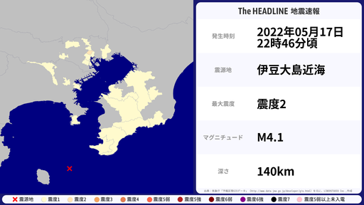 5月17日22時46分頃、東京都で最大震度2を観測する地震がありました。