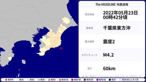 5月23日00時42分頃、千葉県で最大震度2を観測する地震がありました。
