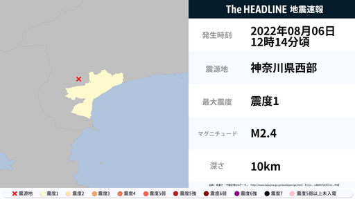 8月6日12時15分頃、神奈川県で最大震度1を観測する地震がありました。