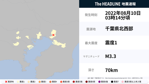 8月10日3時14分頃、千葉県・東京都などで最大震度1の地震を観測
