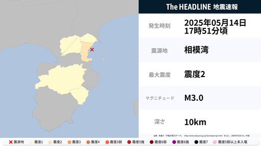 5月14日17時51分頃、静岡県で最大震度2の地震を観測