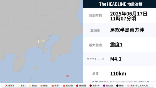 6月17日11時7分頃、神奈川県で最大震度1の地震を観測
