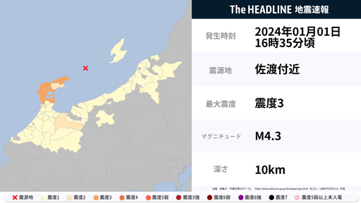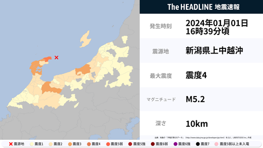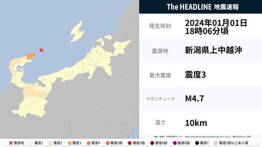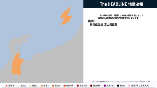 1月1日16時45分頃、新潟県・富山県で震度3以上の地震を観測