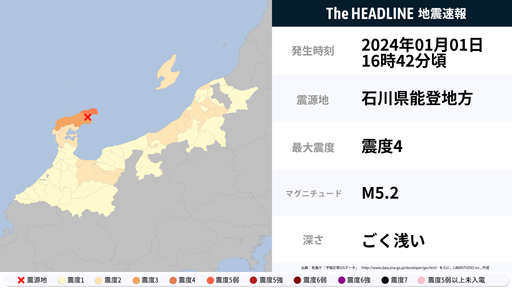 1月1日16時42分頃、石川県で最大震度4の地震を観測