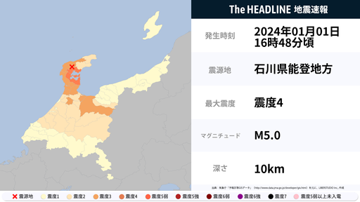 1月1日16時48分頃、石川県で最大震度4の地震を観測