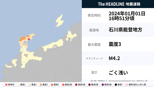 1月1日16時51分頃、石川県で最大震度3の地震を観測