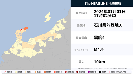 1月1日17時2分頃、石川県で最大震度4の地震を観測