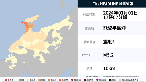 1月1日17時7分頃、石川県で最大震度4の地震を観測