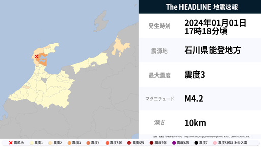 1月1日18時6分頃、石川県で最大震度3の地震を観測