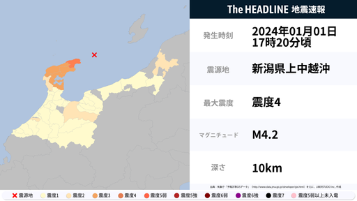 1月1日17時20分頃、石川県で最大震度4の地震を観測