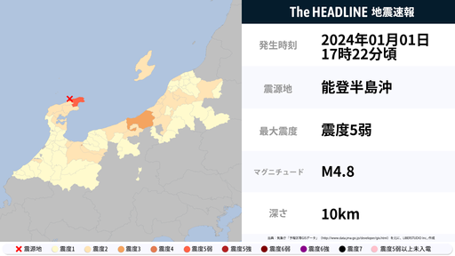 1月1日17時22分頃、石川県で最大震度5弱の地震を観測