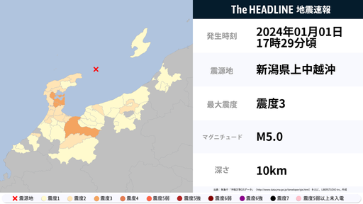1月1日17時29分頃、富山県・石川県で最大震度3の地震を観測