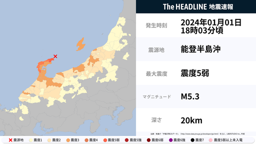 1月1日18時3分頃、石川県で最大震度5弱の地震を観測