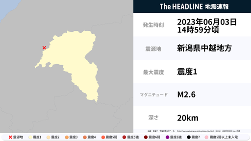 6月3日14時59分頃、新潟県で最大震度1の地震を観測