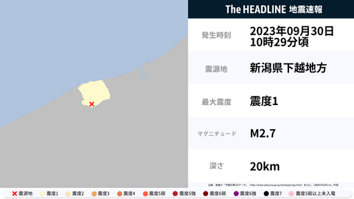 9月30日10時29分頃、新潟県で最大震度1の地震を観測