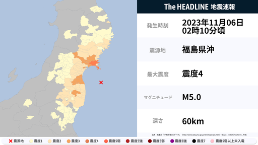 10月5日0時21分頃、福島県で最大震度4の地震を観測