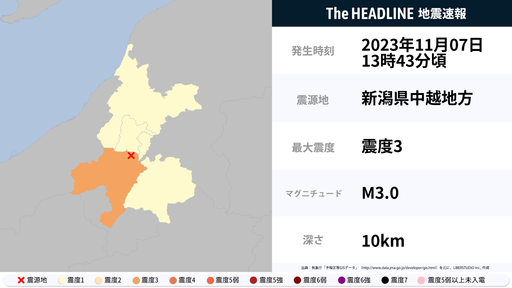 11月7日13時43分頃、新潟県で最大震度3の地震を観測