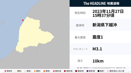 11月27日15時37分頃、新潟県で最大震度1の地震を観測