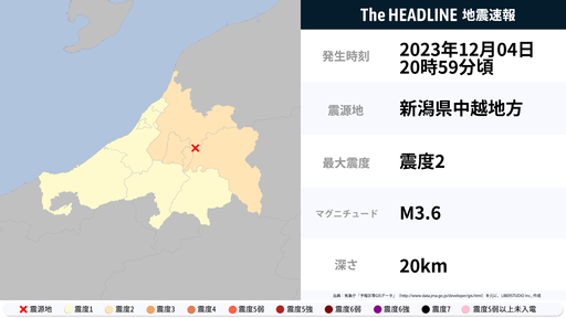 12月4日20時59分頃、新潟県で最大震度2の地震を観測