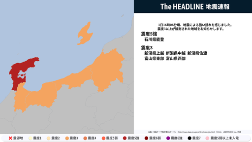 1月1日16時6分頃、石川県・新潟県などで震度3以上の地震を観測